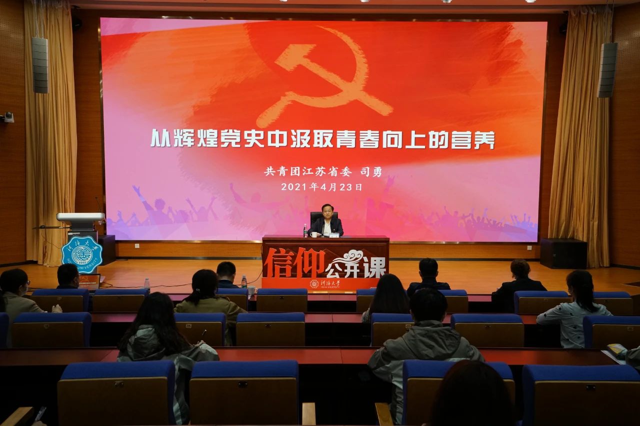 司勇以《从辉煌党史中汲取青春向上的营养》为题,从“百年老店的故事”讲起,带领大家走近生动鲜活的红色人物,重温波澜壮阔的峥嵘岁月,一同回顾了党的百年光辉历程。他指出,学习党史可以补“钙”,能帮助青年强筋壮骨、培根铸魂。党史是青年学子最佳的“钙源”,要从党的奋斗历程中汲取智慧和力量,以一往无前的奋斗姿态和永不懈怠的精神状态,坚定奋勇当先的信心和决心,立志为国家、为社会做有用的事,努力当“强富美高”新江苏建设的有用之才;学习党史可以补“铁”,能帮助青年活力充沛、C位出道。青年学子要通过党史学习“补铁”,练就铁肩膀、硬肩膀,在书山学海的遨游中努力争先进,在科技创新的征途上敢于打头阵,在乡村振兴的田野里勇于立大志,让自己的青春与时代与祖国同频共振;学习党史可以补“氧”,能帮助青年提神醒脑、修身正己。青年学子要到社会的广阔天地中去见世面、长才干,在与人民群众的接触交往中了解国情、立己达人,明辨是非曲直,增强自我定力,矢志追求更有高度、更有境界、更有品位的人生。