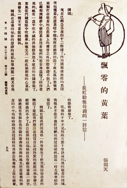 1925年,张闻天重返上海,上海正掀起前所未有的反帝浪潮,他汇入了悲壮的五卅反帝爱国运动的洪流。在人流中,友人郭绍棠叫住他,问他:“为什么不参加国民党?”张闻天脱口回答说:“我要加入CP!”1925年6月,张闻天在沈泽民、董亦湘的介绍下加入中国共产党,走上了革命的道路。在入党时,张闻天创作了抒情小说《飘零的黄叶》,小说主人公青年知识分子长虹,满怀深情地告诉母亲,要为“创造人生的真意义”而无私地寻求光明,并请求母亲祝福他的再生。张闻天用文学典型化的方法向党所作的思想发展轨迹的自我解剖,而小说后部长虹对母亲说的那些话,简直就是张闻天对党立下的誓言: