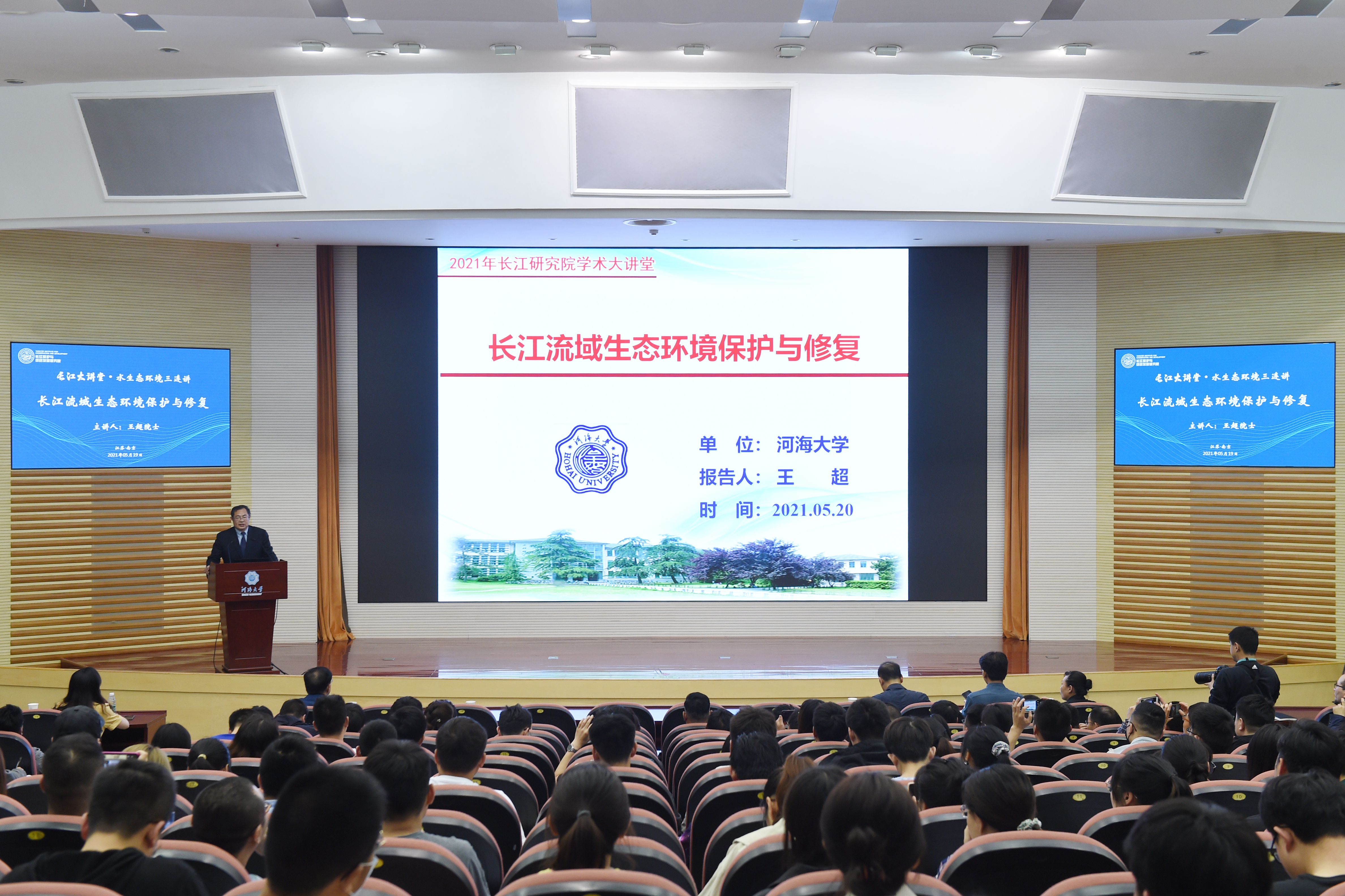 近期,由长江保护与绿色发展研究院主办的“长江大讲堂”之水生态环境三连讲陆续在我校举行。5月19日,中国工程院院士、河海大学教授王超为该系列讲座第二讲作题为《长江流域生态环境保护与修复》的报告。报告会由中国工程院院士、长江保护与绿色发展研究院院长张建云主持。近万名校内外专家学者通过线上、线下同步直播的形式参与了本次讲座。