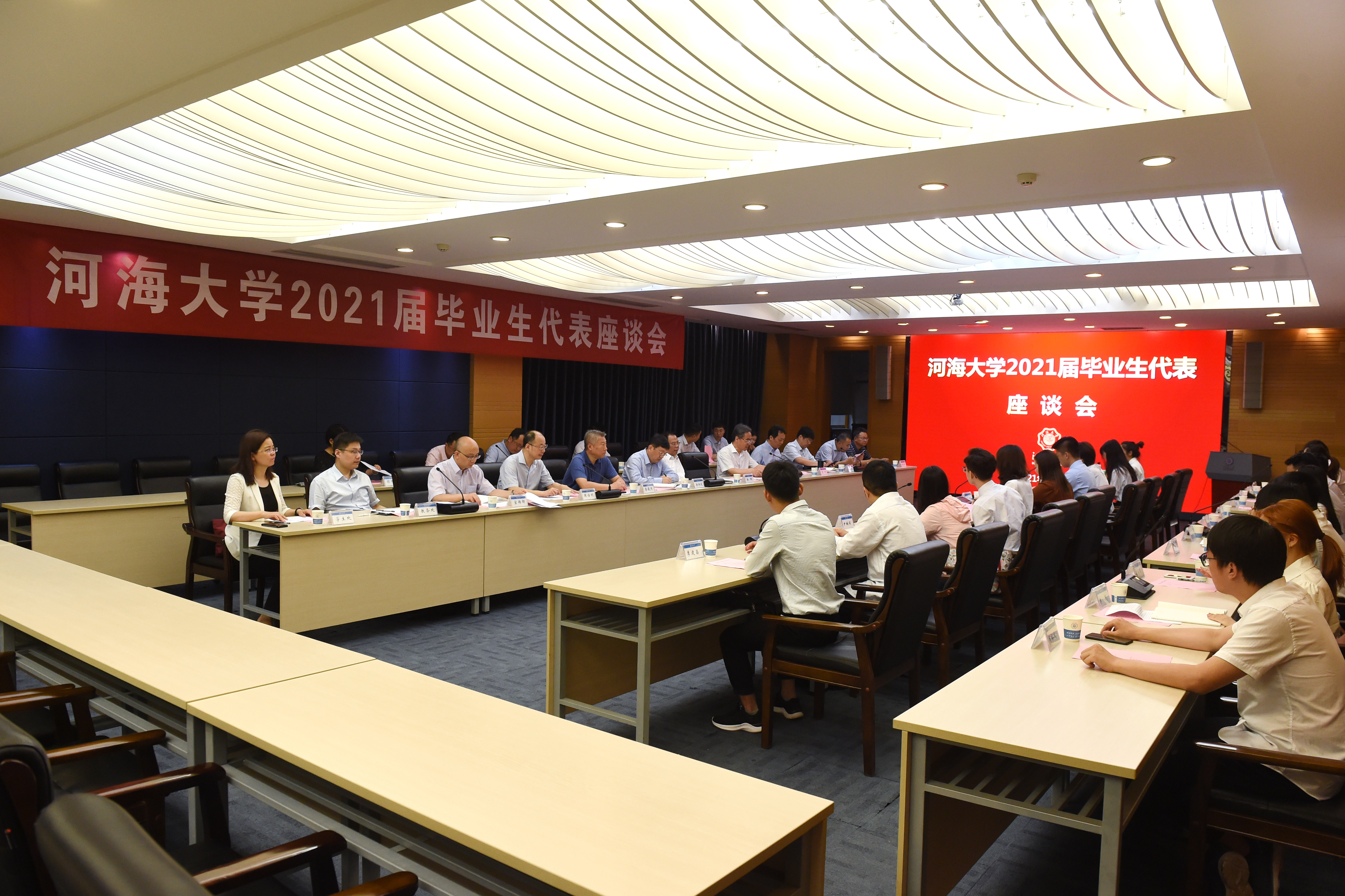 6月16日,河海大学举行2021届毕业生代表座谈会。校党委书记唐洪武、校长徐辉、常务副校长李俊杰、校党委副书记郭继超、校长助理周语明出席会议。