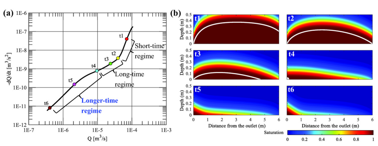 (a)前期和中期饱和区主导排水 (b)后期非饱和区持续排水