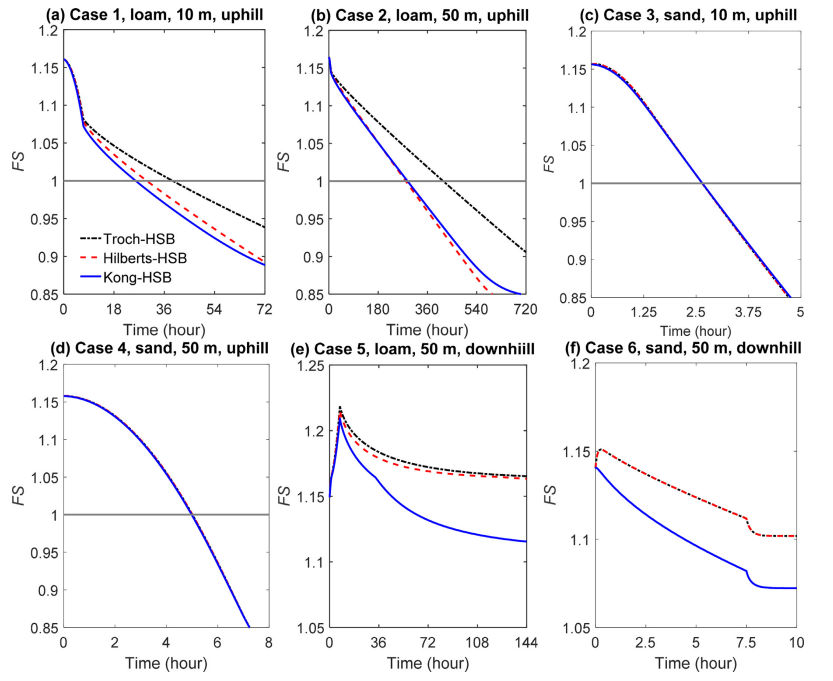 针对边坡稳定性问题,基于Kong-HSB理论,课题组定量分析了坡顶和坡底边界水位变化时,侧向流对滑坡风险的影响。研究结果表明,当坡顶水位抬升时,对于坡度适中的壤土边坡,侧向非饱和流会诱发滑坡提早发生,特别是当上坡边界水位抬升较快(如坡顶出现雨后积水等情况、人为蓄水)时,侧向非饱和流对边坡失稳的影响更大,进一步完善了对突发性滑坡风险潜在影响因素的认识。
