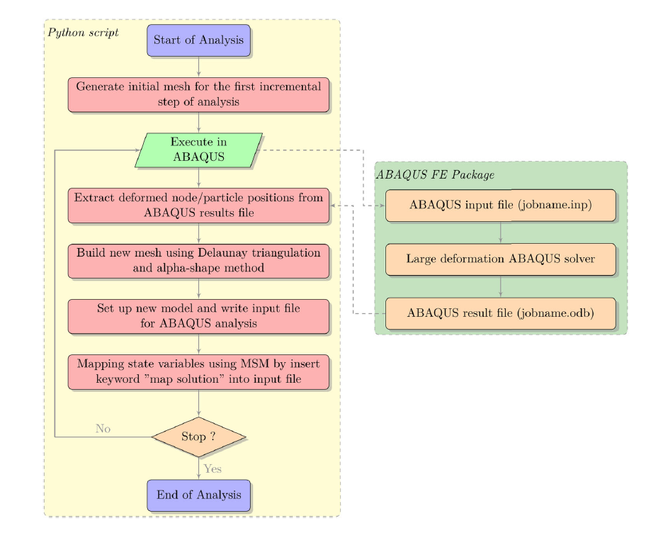 粒子有限元法将有限元网格中的节点视为自由粒子,根据分析步的位移增量更新粒子的位置,并通过周期性的计算域重新识别和网格重新剖分解决传统有限元法存在的网格扭曲问题,能有效的实现岩土大变形数值模拟。研究采用Abaqus的内置函数进行常规增量FEM分析,并使用mesh-to-mesh mapping方法实现场变量的映射,使用单个Python脚本就能实现PFEM数值模拟,显著减少了编码工作量,为PFEM在岩土工程中的推广应用奠定了基础。