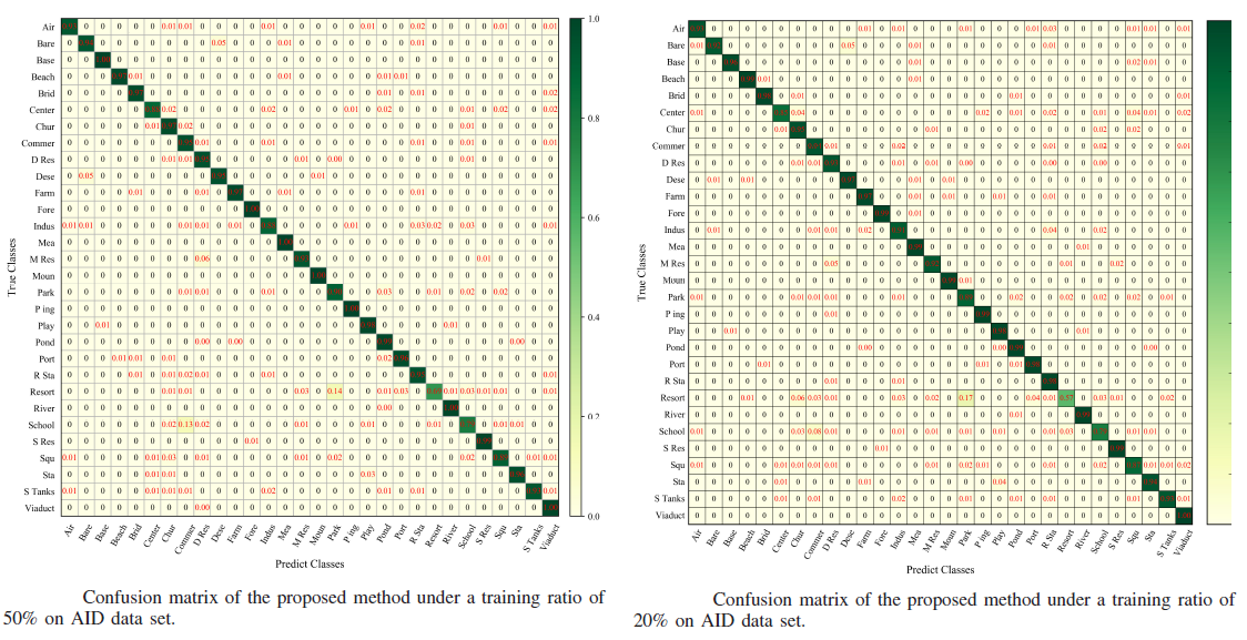 作者将提出方法在著名的UCM、AID等数据集上进行了实验,图5为在AID上不同训练测试比例下的混淆矩阵。可以看出,提出模型对具有高类间相似性的类别能做到准确分类,并对具有相似地物和纹理特征的类别的预测精度也较高。