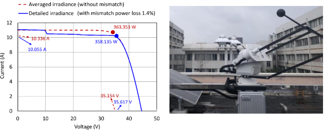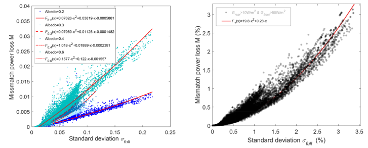 由于地面上组件自阴影的存在,双面光伏组件背表面上的辐照均匀性不同。一般条件下,单块组件由于背面不均匀辐照导致的失配损失很少,但在评估双面光伏阵列真实性能或辐照资源丰富时,这部分损失需要考虑。传统的电池级电气模型(详尽计算模型)并不能适用于双面组件发电性能的快速评估。为了解决这一难题,白建波教授团队研究通过将背面发电失配损失(Mismatch Loss)参数化,定义成总辐照度变化(标准偏差σ)的函数,重新建立了方程,从而间接的考虑地面阴影影响。一旦求得每片电池或者特征电池的受光量时,便可以通过简化方程直接得出损失功率,绕过电气模型,高效地实现了双面组件发电性能的快速评估。