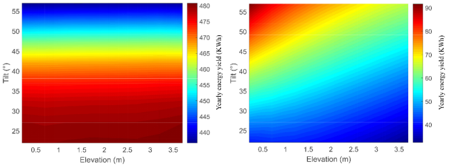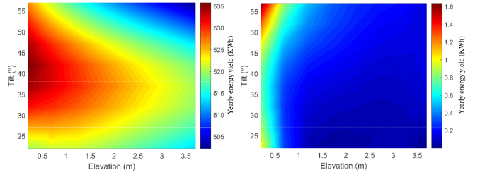 图四:双面组件正面年发电量(左图)和背面年发电量(右图)随安装高度(横坐标)和安装角度(纵坐标)的影响