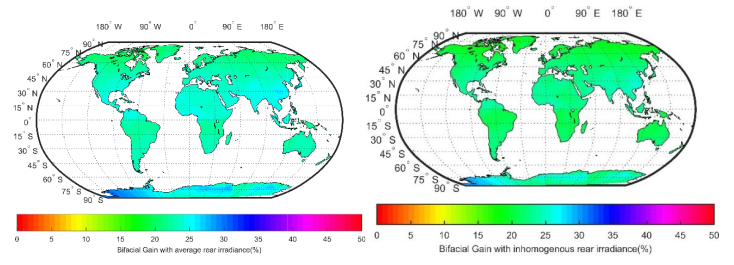 图七:全球固定配置的双面光伏组件双面增益[%]仿真应用(左图依据均匀辐照理论,右图依据不均匀辐照理论,更加符合实际情况)