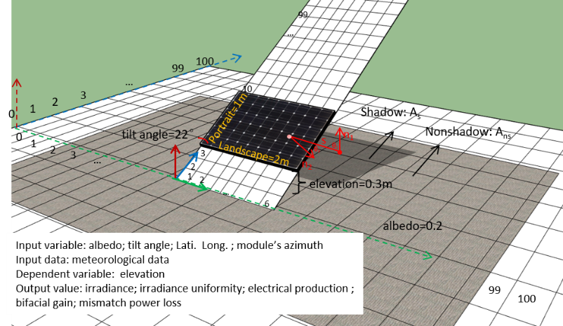 常规单面光伏组件只有正面受光,受光量在组件倾斜面上是均匀的。而双面光伏组件则不同,需要以每片电池为单元详尽计算。研究在Matlab中搭建了虚拟的光伏组件环境,光伏组件在空间上的每个点都能被精确定位,通过点与点之间的能量转换则可以通过积分形式被量化,从而实现双面光伏组件发电量的统计。