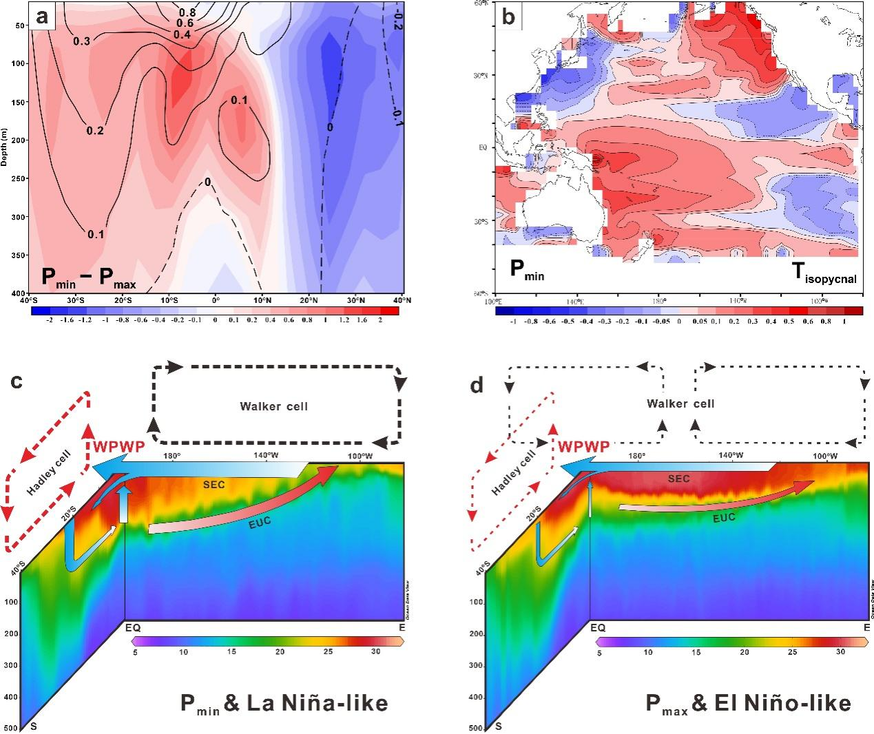 研究发现,在热带西太平洋,相较于表层水体,次表层水体有着不同的信号及来源,除了受十万年的全球冰期间冰期的气候背景影响,还以两万年的岁差周期为主要变化特征。通过与其它海区的沉积记录对比和完全海气耦合模式(CESM)的瞬变数值模拟,发现在过去三十六万年里,热带西太平洋的次表层水体一直受南太平洋亚热带海区潜沉的表层水影响。正是该表层水体的潜沉过程,将地球轨道岁差信号通过等密度面传送到热带西太平洋海区的次表层。而该潜沉水体温盐属性的改变,直接影响了热带西太平洋上部水体的层化结构,从而产生了岁差尺度上的类ENSO过程。在岁差处于极小值时,南半球夏至日对应远日点,冬至日对应近日点,因此南半球夏天更长、冬天更暖。这会引起南太平洋亚热带潜沉区表层水体的温盐同步升高,增强向西太平洋输送的暖信号,从而使西太平洋更加温暖,增大热带太平洋东西向的海表温差,导致热带太平洋更偏向类拉尼娜态,反之在岁差极大值时,热带太平洋则更偏向类厄尔尼诺态。