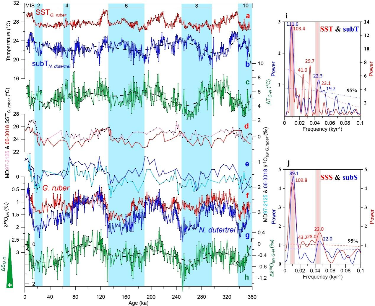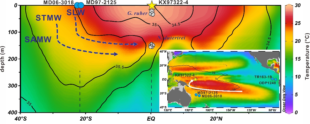 11月22日,我校海洋学院齐义泉教授课题组博士后张帅与合作者在Nature出版集团的刊物《Communications Earth & Environment》上发表论文,通过测试热带西太平洋暖池核心区海底沉积物中多种有孔虫壳体的地球化学(稳定氧同位素和镁钙比值)变化,在地质时间尺度上,重建了最近三十六万年西太平洋海区的表层和次表层的水体温度与盐度的演化历史,并探讨了太平洋热带与亚热带海区浅层温盐环流在地球轨道岁差频段类ENSO过程中的关键作用。