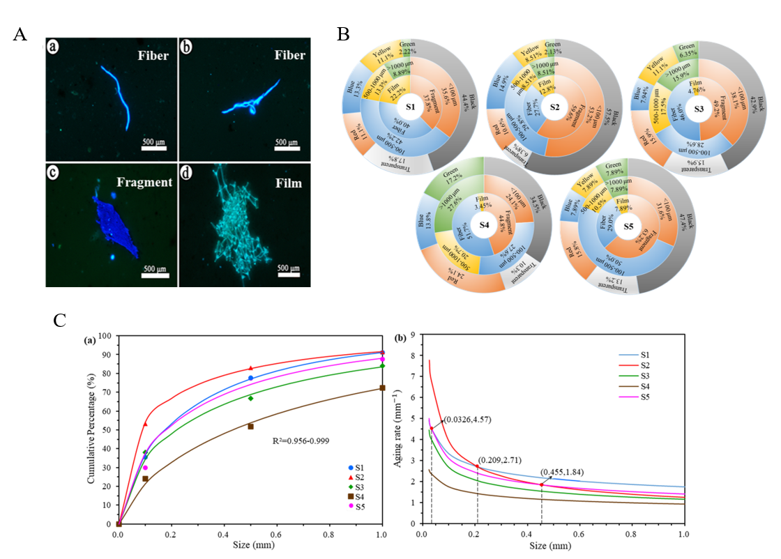 图3 围垦区土工布微塑料(A)物理形貌表征(B)形态特征定量评价结果及(C)风化特征模拟结果图