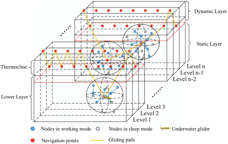 近年来,随着水下滑翔机这类轻装备的发展,利用轻装备提升水声传感器网络数据收集效率的研究也逐渐被关注。韩光洁团队设计了一种用于水下滑翔机的分层数据收集算法。该方案基于埃克曼漂流效应将网络分为动态层和静态层。在动态层,利用基于虚拟立方体的多跳方法将数据包传输到中心区域。在静态层,采用改进的基于密度的聚类技术将每个节点分配到适当的集群,而水下滑翔机从集群头节点收集数据。